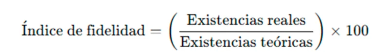 El índice de fidelidad mide la precisión entre el inventario registrado y el real, indicando la eficiencia del control de stock. Fórmula básica:
