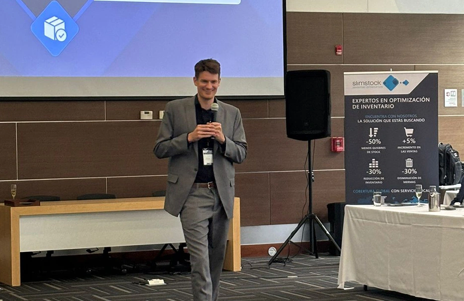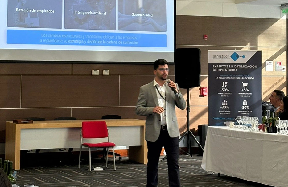 A continuación, Jack Inglis, Country Manager de Slimstock Chile, habló sobre los desarrollos globales de Slimstock en el espacio de inteligencia artificial y los nuevos clientes de Business Intelligence en LATAM. Además, tuvo la oportunidad de hablar sobre un caso práctico del mercado para proteger los márgenes de las empresas y destacando el papel crucial que significa promover el rol de Supply Chain en este proceso.