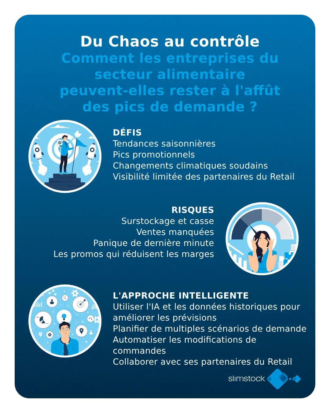 Si vous êtes dans l’industrie alimentaire, ces pics représentent une belle opportunité, mais en tirer parti n’est pas toujours simple. Comment s’assurer que le bon stock soit au bon endroit au bon moment ? Et comment éviter de se retrouver avec des surplus une fois la période de forte demande passée ?