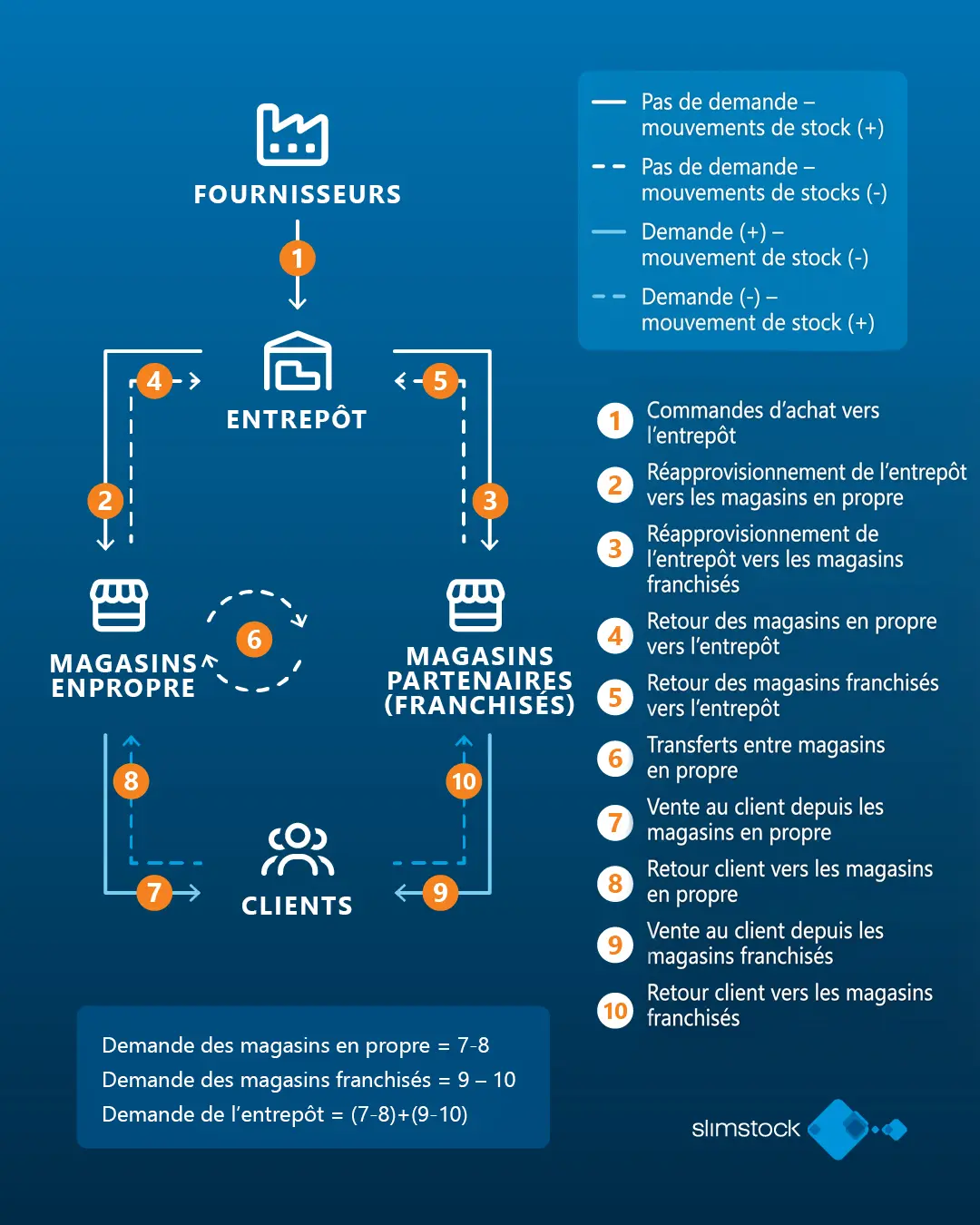 Ce schéma représente un blueprint logistique type avec un entrepôt central, des magasins et des clients. Il illustre quels mouvements génèrent de la demande et lesquels n’en génèrent pas.
