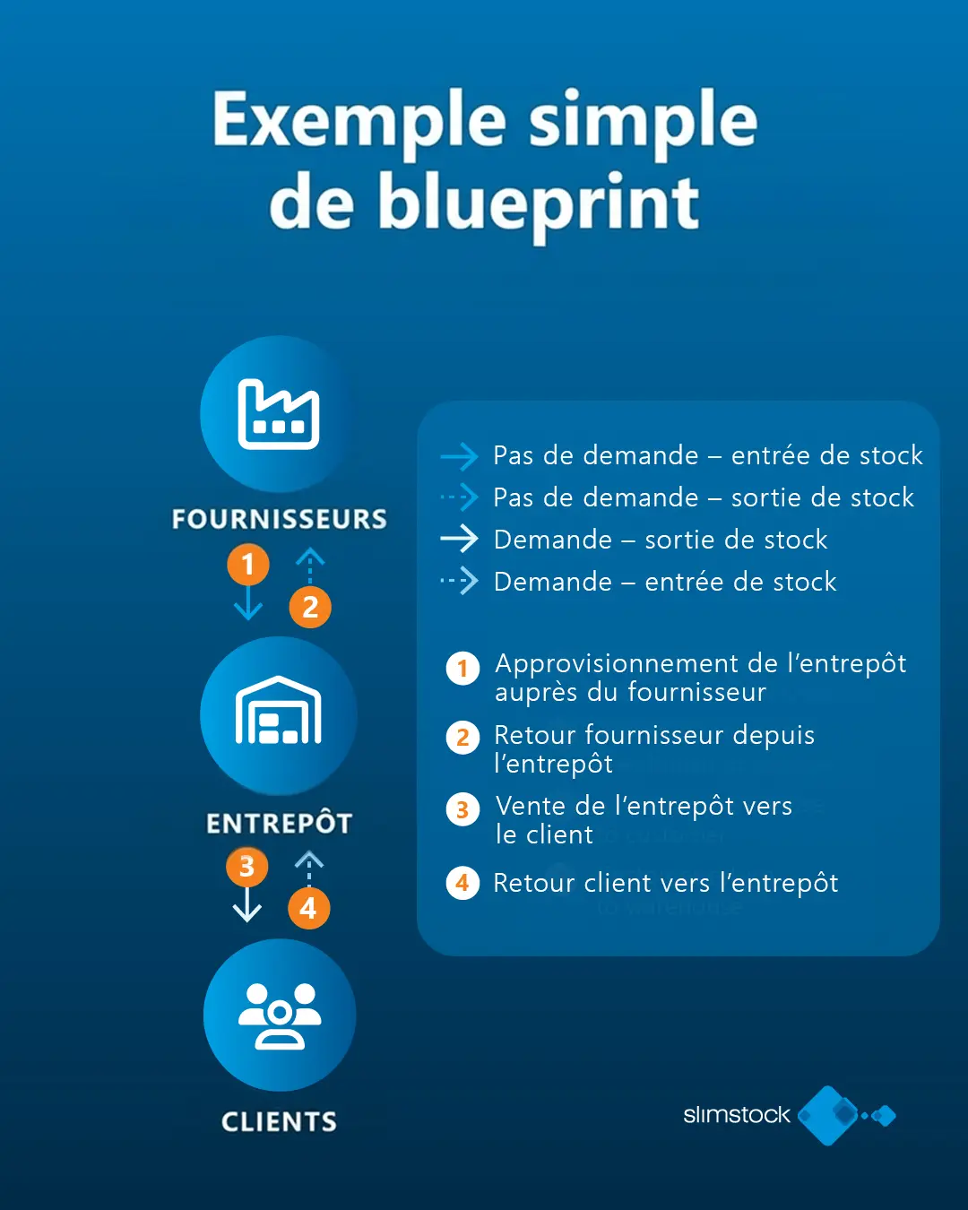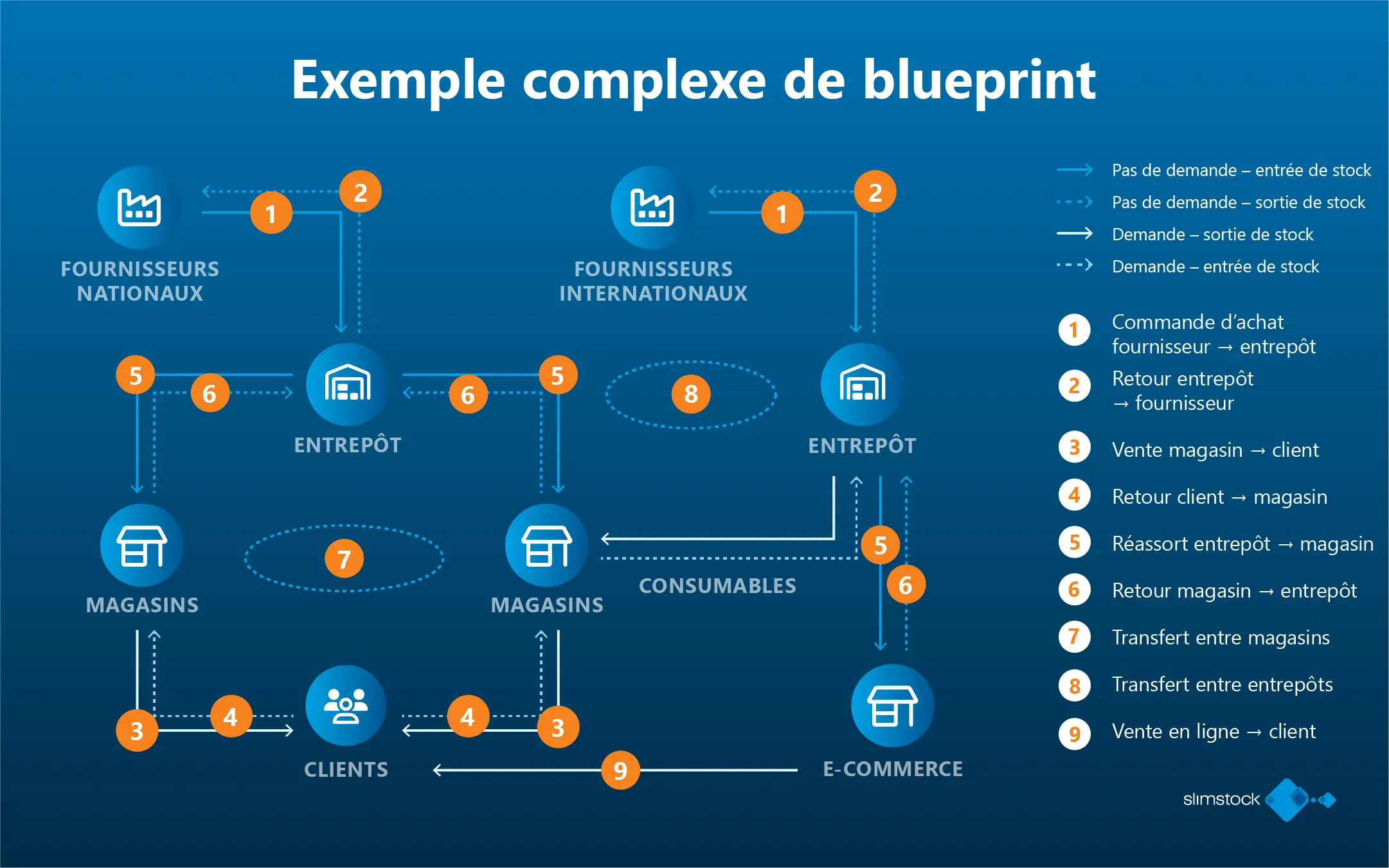 Le blueprint inclut également d’autres mouvements courants, tels que les retours des magasins vers l’entrepôt ou les transferts entre magasins. Ces flux ne représentent pas une demande globale, même s’ils ont un impact sur les niveaux de stock à chaque point du réseau.