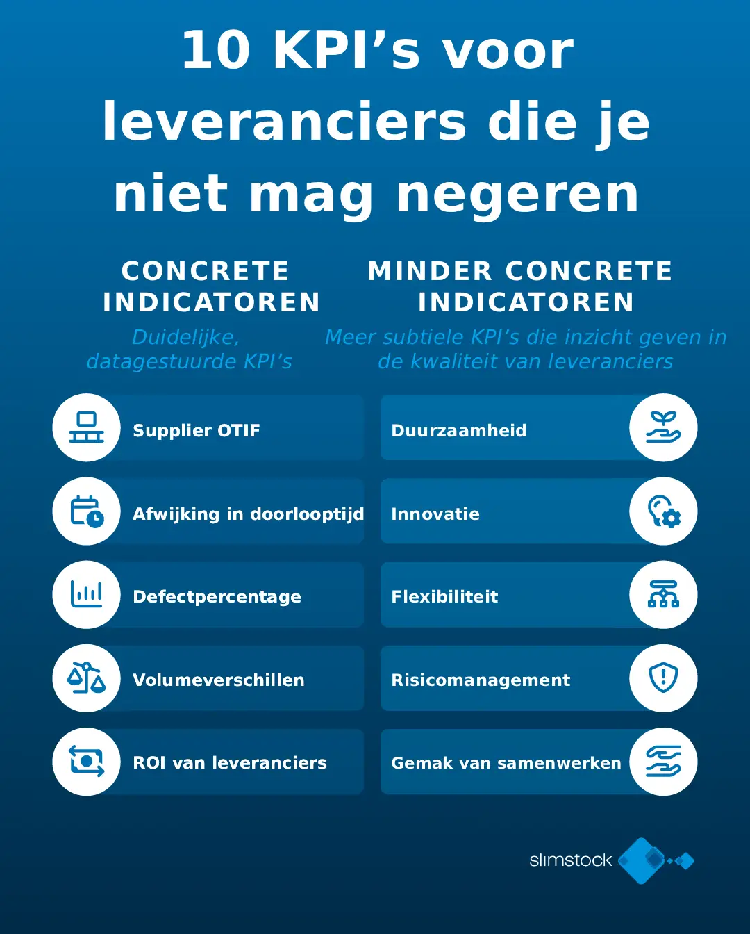 In dit artikel worden 10 cruciale KPI’s voor leveranciers belicht, variërend van meetbare indicatoren zoals On-Time In-Full (OTIF), afwijkingen in doorlooptijd en defectpercentages tot meer immateriële factoren zoals duurzaamheid, innovatie en de kwaliteit van de samenwerking. Leveranciers kunnen uw succes maken of breken, dus het is essentieel om een hoge mate van vertrouwen met hen op te bouwen