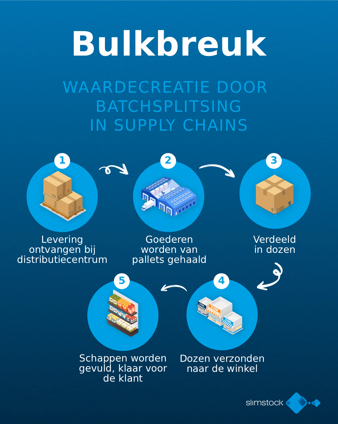 Een voorbeeld van bedrijven met een zeer hoge bulkbreuk zijn grote e-commerceportals. In deze omgevingen wordt één enkele inputbatch omgezet in honderden of duizenden individuele outputlijnen. Denk bijvoorbeeld aan bedrijven die containers vol met hetzelfde product kopen en deze vervolgens via internet aan de eindklant verkopen. Het belangrijkste hierbij is de logistieke capaciteit om snel en nauwkeurig te splitsen, aangezien de waarde niet zozeer in het product ligt als wel in flexibiliteit en beschikbaarheid.