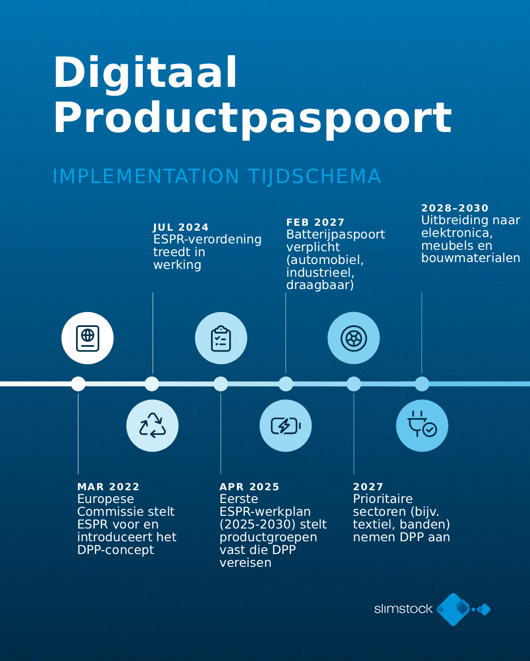 Gezien de ambitie van deze verordening zal de uitvoering van de DPP geleidelijk gebeuren. De EU heeft per sector prioriteiten vastgesteld op basis van de milieu-impact en het circulaire potentieel van elke industrie. De eerste sectoren die aan de beurt komen, zijn die met de grootste ecologische voetafdruk of het grootste afvalvolume, zoals batterijen, elektronische apparatuur, textiel en schoeisel.