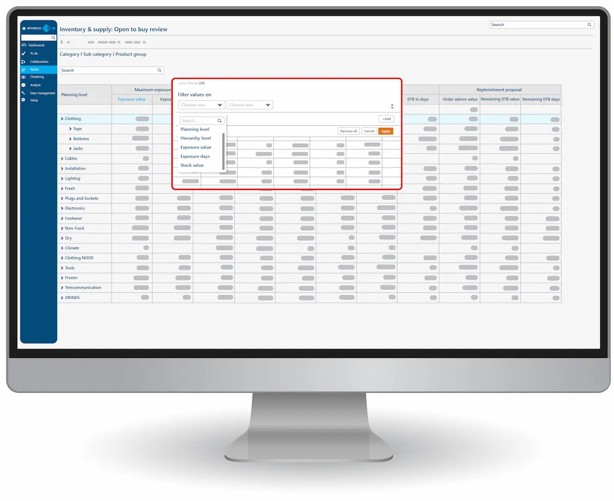 Com os recursos OTB do Slim4, as equipes de compras evitam tanto o excesso quanto a falta de pedidos. Em vez disso, podem priorizar itens críticos e confiar em hierarquias definidas pelo usuário, permanecendo sempre dentro dos limites financeiros.