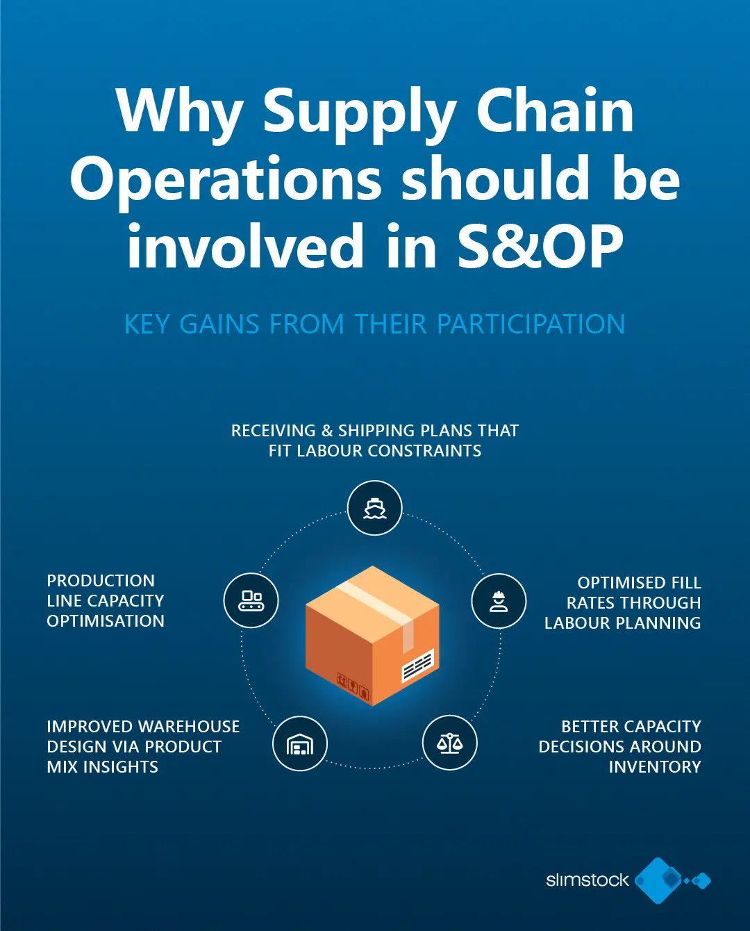 Även om teamen för supply chain planning (SCP) ofta är centrala för datagenereringen, bör supply chain-verksamhetens roll inte förbises. Beslut som fattas under S&OP-processen påverkar ofta arbetskraft, transport och lagerhållning, vilket gör det viktigt att verksamheten har en plats vid bordet när dessa beslut fattas.