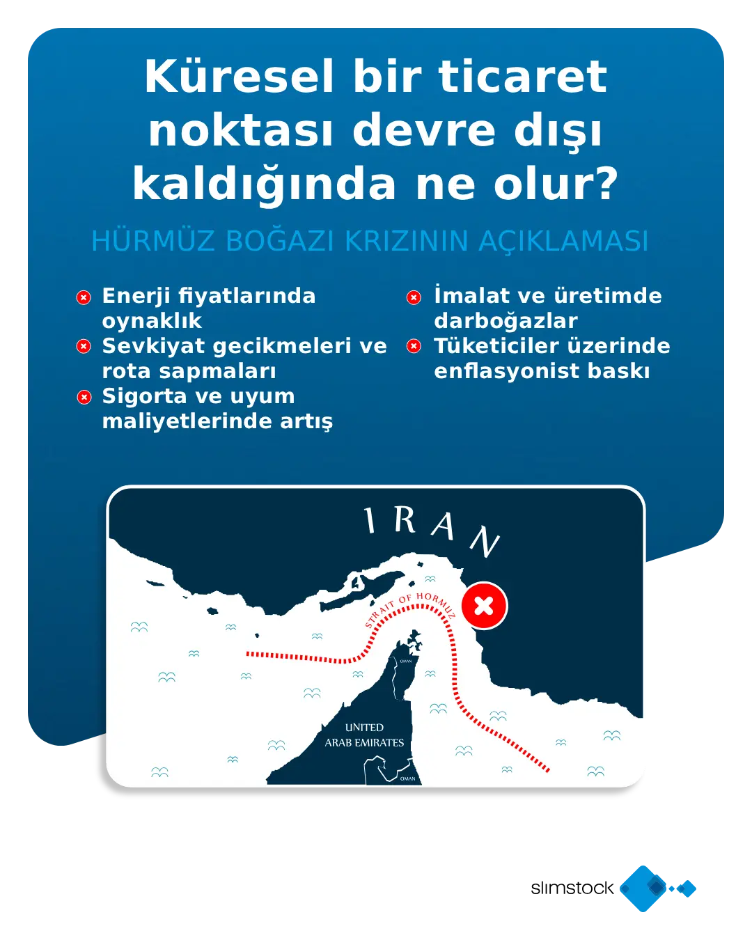 Modern tedarik zincirleri, öngörülebilir yakıt maliyetleri, güvenilir nakliye süreleri ve nakliye kapasitesine tutarlı erişim gibi istikrar varsayımları üzerine kurulmuştur. Hürmüz Boğazı gibi kritik bir darboğaz istikrarsız hale geldiğinde, bu varsayımlar çöker.